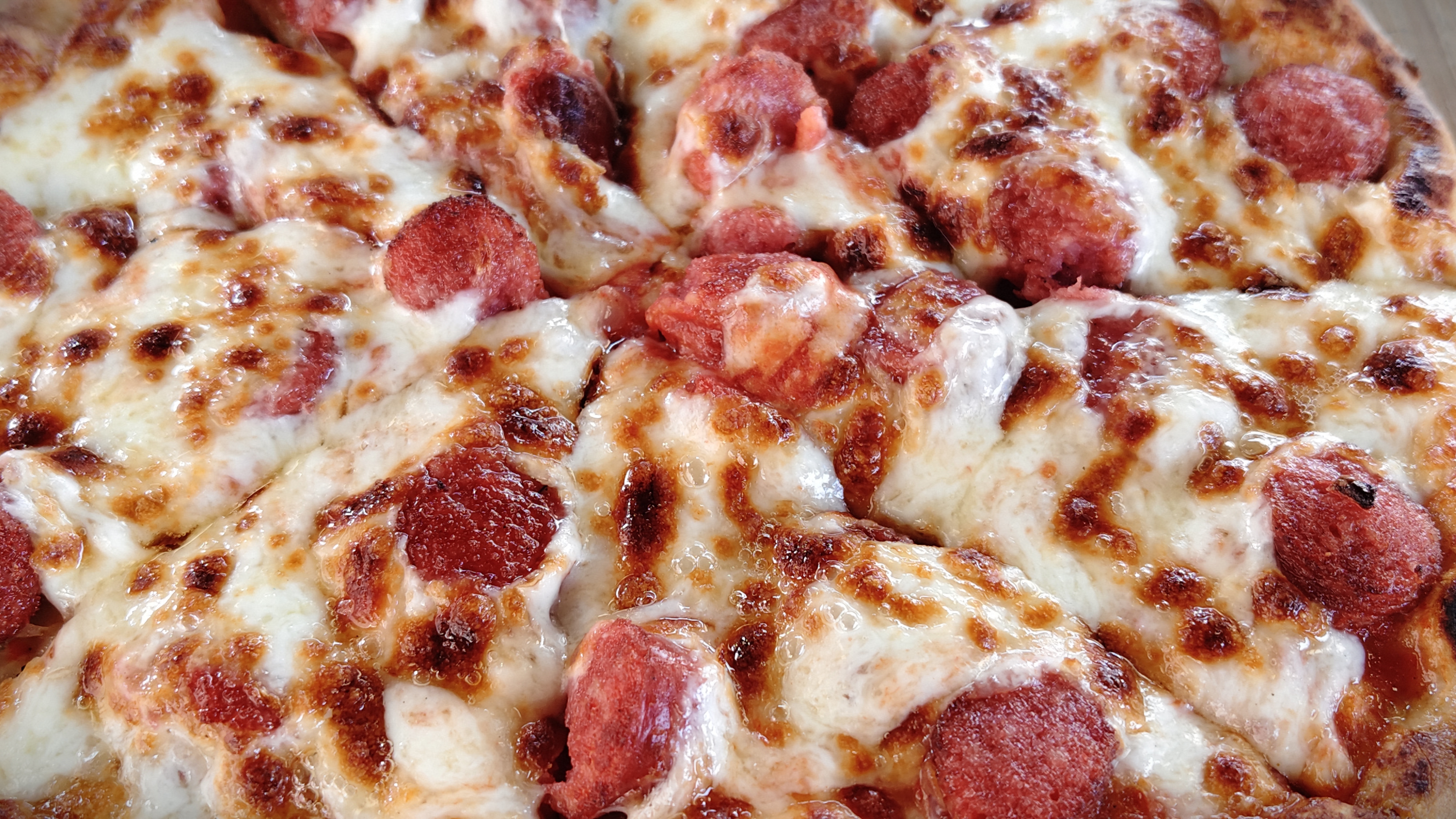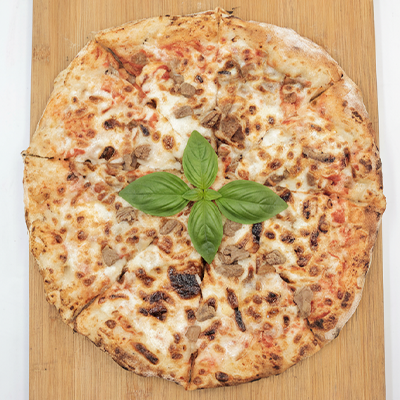 Roasted meat, Fresh Mozzarella, sauce topped with olives
